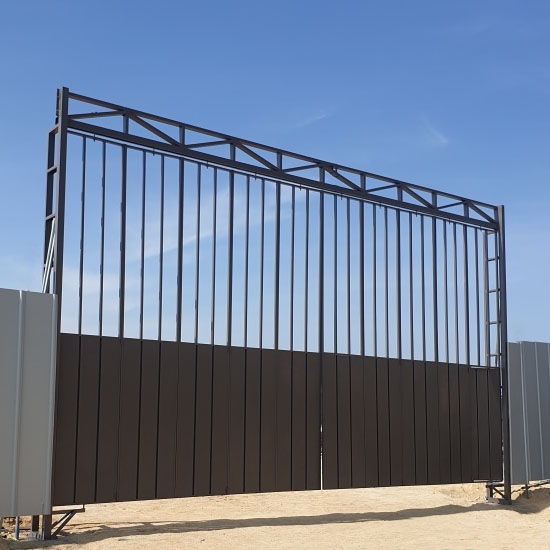 가설출입문은 현장에서 사람의 통행과 자재의 출입을 위해 작업 동선, 가설 도로, 주변 도로와의 관계 등을 고려하여 수량과 위치를 결정하여 설치한다.
