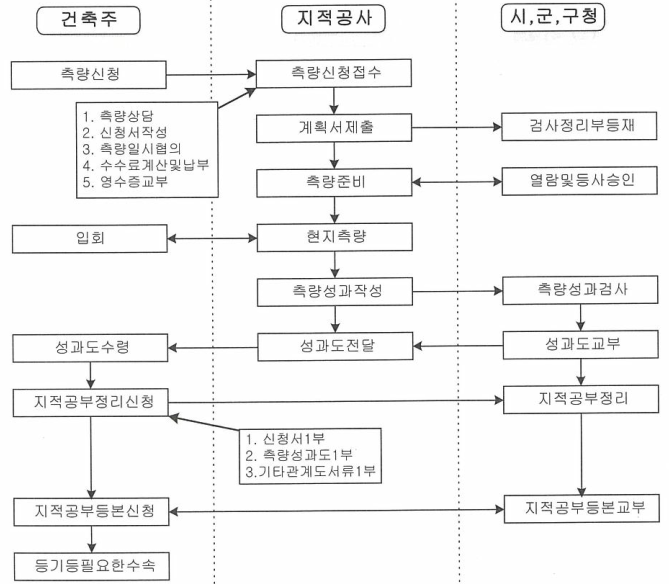 측량은 관할지역 국토정보공사(지적공사)에 신청하여 실시하게 되며, 측량과정에서 인접 대지의 주인과 해당 공사의 건축주, 감독자, 감리자 등을 입회시켜 명확히 하여야 한다.