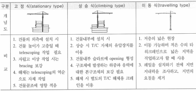 타워 크레인은 붐의 작동방식과 상승·이동에 따라 아래와 같이 분류할 수 있다.