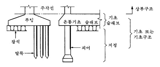 기둥, 벽 등으로부터 상부구조물에서 전달되는 힘을 받아 지정에 전달하는 건축물의 부분을 말한다.