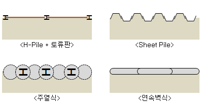 흙막이 계획선을 따라 시트파일을 디젤해머 등으로 타입하여 지수벽 및 흙막이벽을 동시에 형성하는 공법이다.